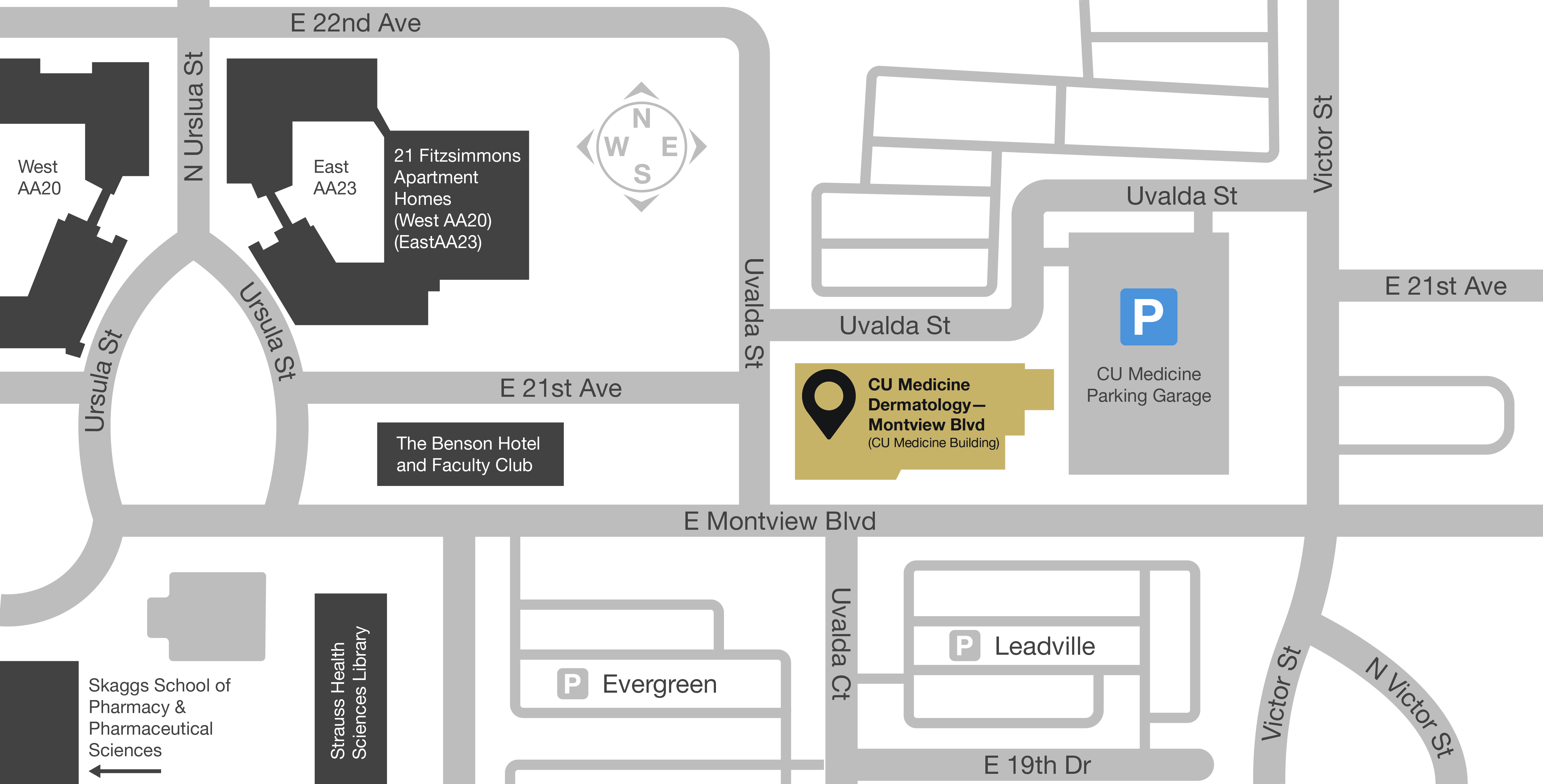 Our dermatology office is conveniently located on Montview Boulevard in the CU Medicine Building. Parking is simple and patient friendly. Patients are invited to park in the CU Medicine Parking Garage, using the visitor entrance on Uvalda Street. A diagram below depicts the parking for this clinic.